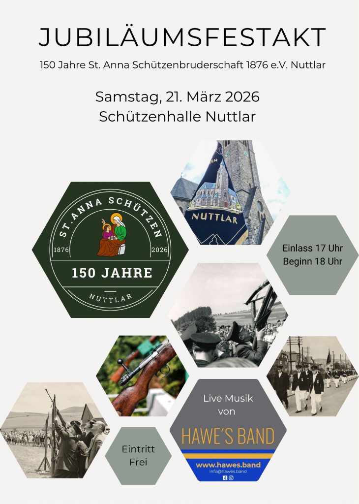 In diesem Jahr feiert die St.-Anna-Schützenbruderschaft Nuttlar ihr 150jähriges Bestehen. Zum Auftakt in das Jubiläumsjahr findet am Samstag, den 21.03.2026 ein großer Jubiläums Festakt in der Schützenhalle statt.